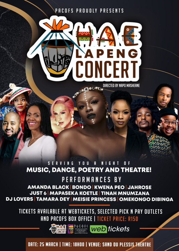 PACOFS is thrilled to unveil the inaugural “Hae Lapeng” Concert line up and programme coming to Sand du Plessis Theatre on March 25th 2023, hosted by Freestate born actress Mapaseka Koetle. The programme and lineup will showcase an array of performances, from song, dance, poetry and monologues.