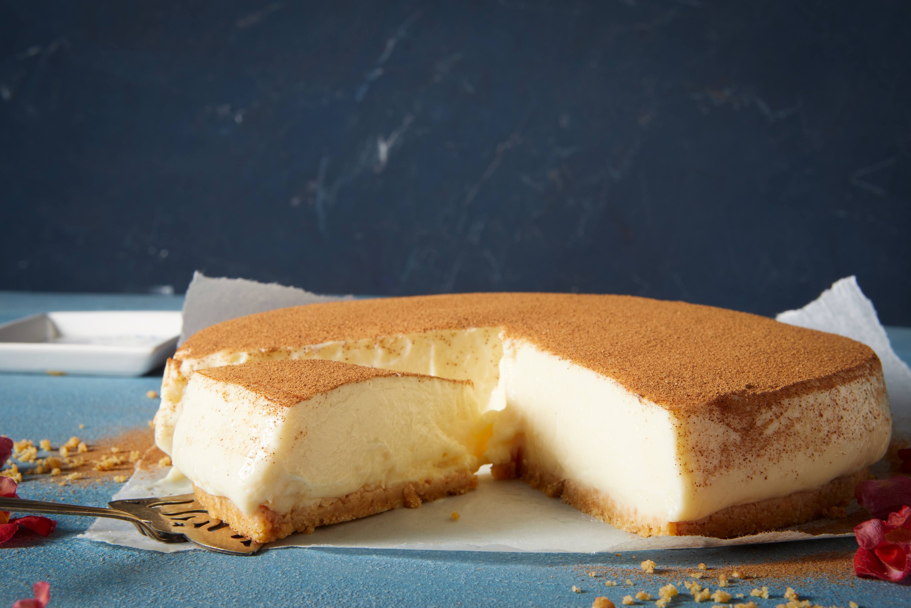 Pour the hot liquid over the egg mixture and mix well. Return the mixture to the pan and cook for 3-4 minutes, or until thickened. Pour the mixture into the prepared pan and allow to set in the fridge for at least 2 hours