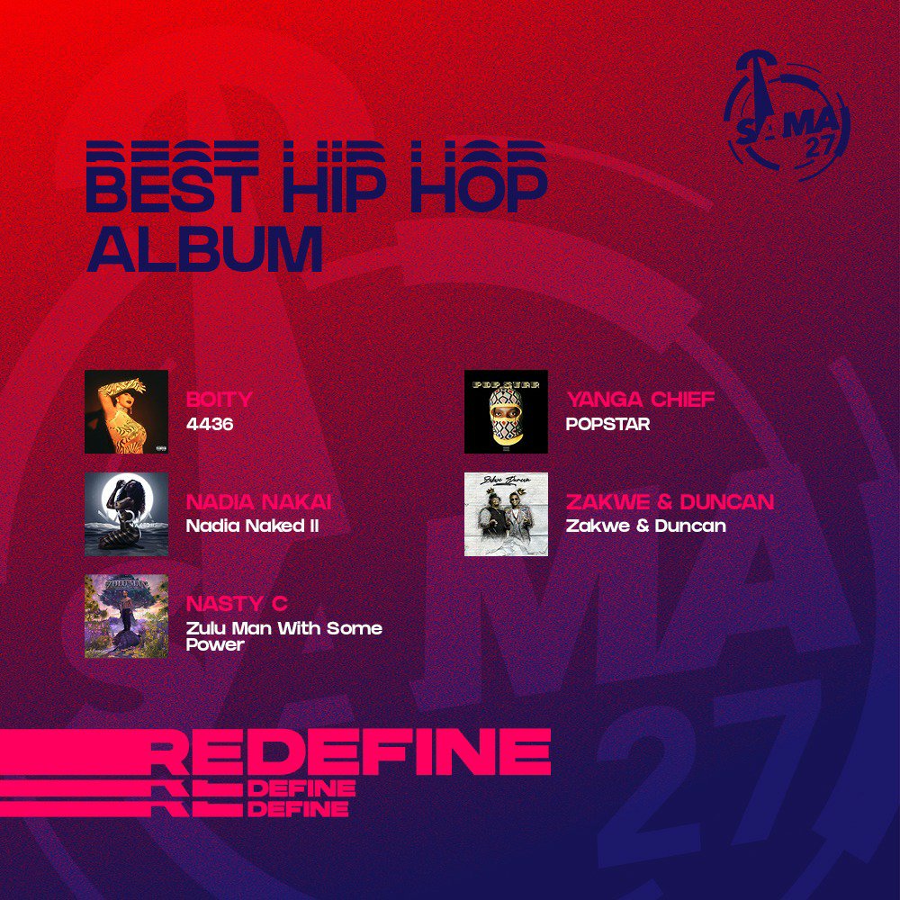 The Best Hip Hop Album category is a clash of the titans as Boity (4436) goes to battle with Nasty C (Zulu With Some Power); Yanga Chief (Popstar); Nadia Nakai (Nadia Naked II); and Zakwe & Duncan (Zakwe & Duncan).