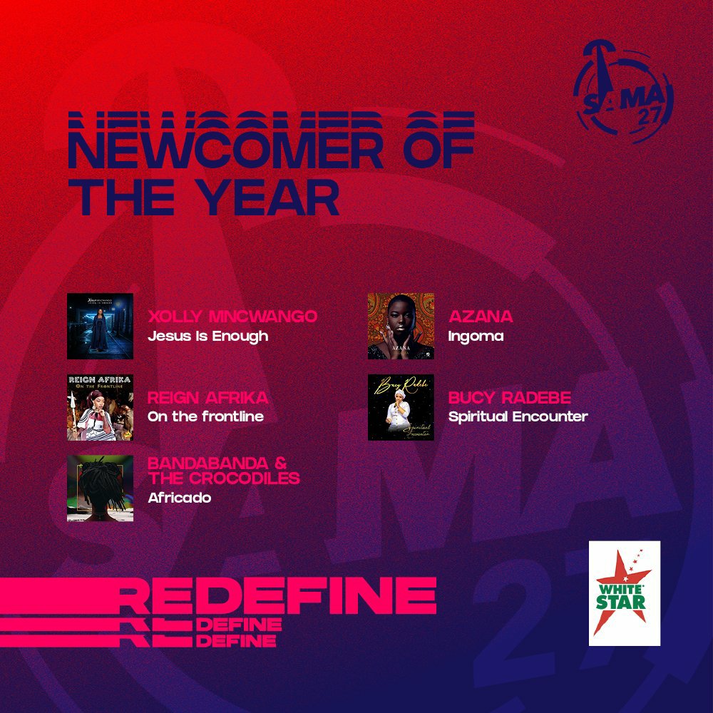 On the White Star Newcomer of the Year front Bucy goes up against Xolly Mncwango (Jesus is Enough); Reign Africa (On The Frontline); BandaBanda & the Crocodiles (Africado); and Azana (Ingoma).