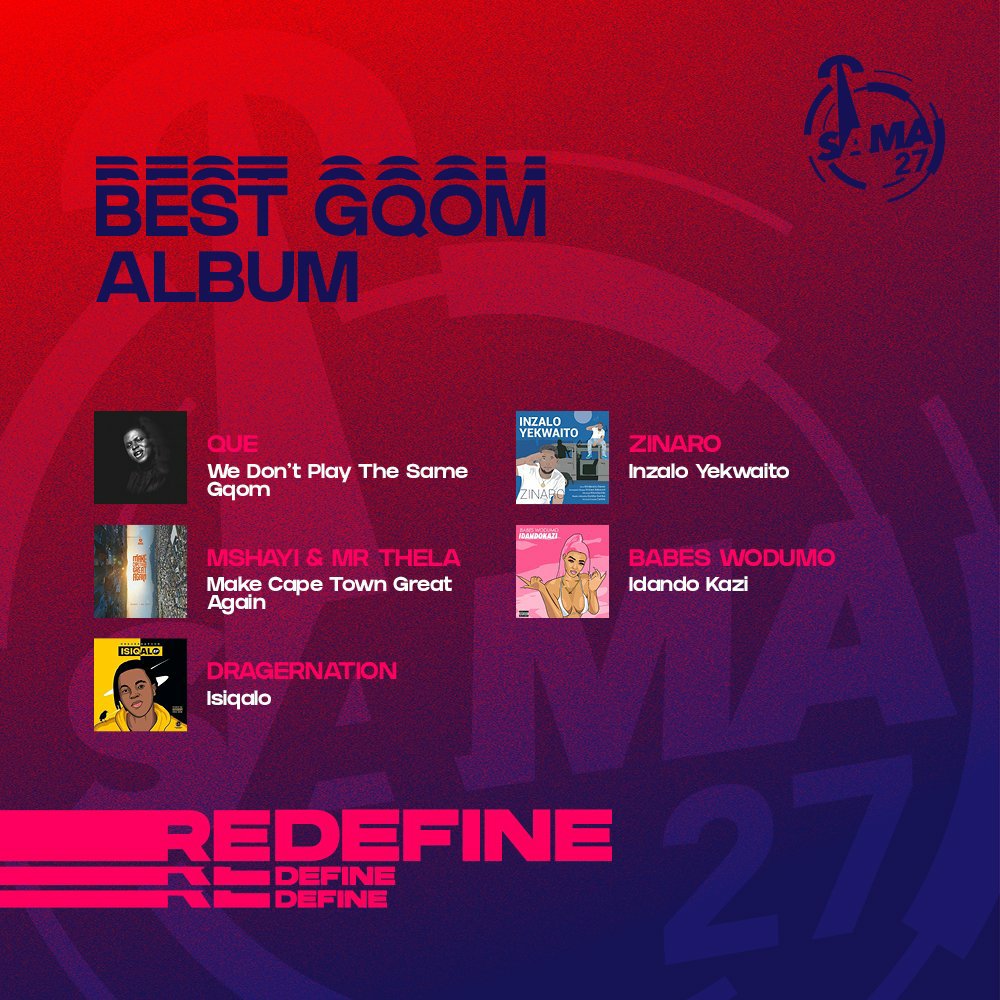 Best Gqom Album sees Babes Wodumo (Idando Kazi) take on Que (We Don’t Play the Same Gqom); Mshayi & Mr Thela (Make Cape Town Great Again); DragerNation (Isiqalo); and Zinaro (InzaloYekwaito).