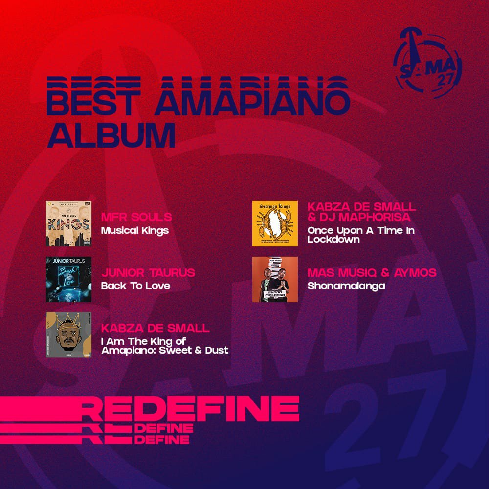 One of the new categories introduced at SAMA27, Best Amapiano Album, yielded a competitive race with Junior Taurus (Back to Love) taking on MFR Souls (Musical Kings); Kabza De Small (I Am The King of Amapiano: Sweet & Dust); Kabza De Small & DJ Maphorisa (Scorpion Kings) (Once Upon A Time In Lockdown); and Mas Musiq & Aymos (Shonamalanga). At three nominations, Junior Taurus is one of the most nominated artists.